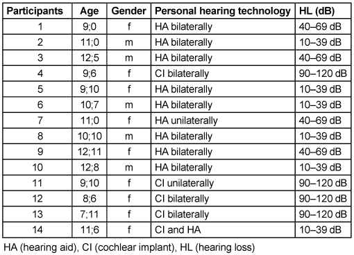 [1] Stevenson J, Kreppner J, Pimperton H, Worsfold S, Kennedy C. Emotional and behavioural difficulties in children and adolescents with hearing impairment: a systematic review and meta-analysis. Eur Child Adolesc Psychiatry. 2015 May;24(5):477-96. DOI: 10.1007/s00787-015-0697-1[2] Theunissen SC, Rieffe C, Netten AP, Briaire JJ, Soede W, Kouwenberg M, Frijns JH. Self-esteem in hearing-impaired children: the influence of communication, education, and audiological characteristics. PLoS One. 2014 Apr 10;9(4):e94521. DOI: 10.1371/journal.pone.0094521