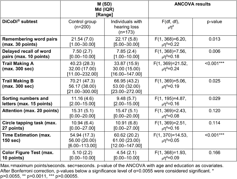 Table 2: Descriptive statistics and results of the ANCOVA for the DiCoDi® subtests
