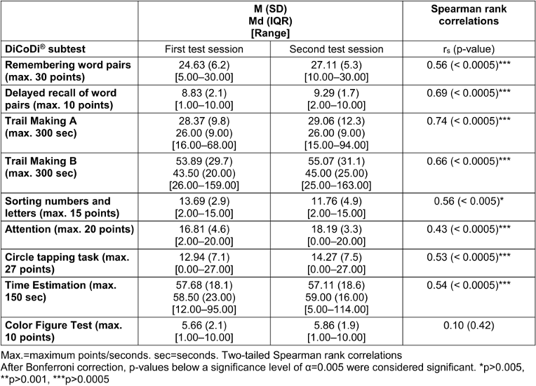 Table 3: Test-retest reliability of the DiCoDi® subtests