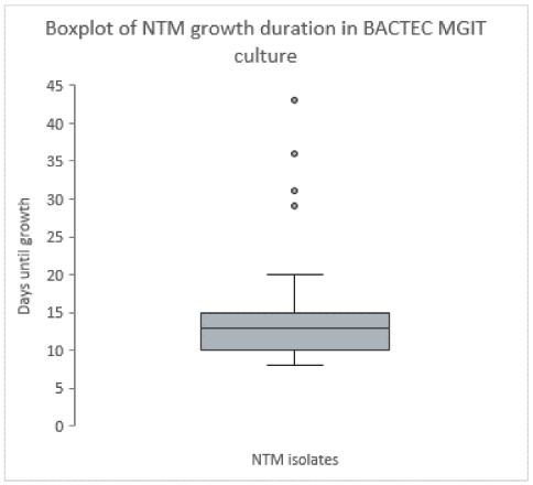 We conducted descriptive analyses, and results are displayed in tables using frequency counts and proportions. We investigated the mean and median, the range (min-max), and the interquartile range (IQR 25th; 75th percentile) to summarize the duration for NTM growth in the figure.