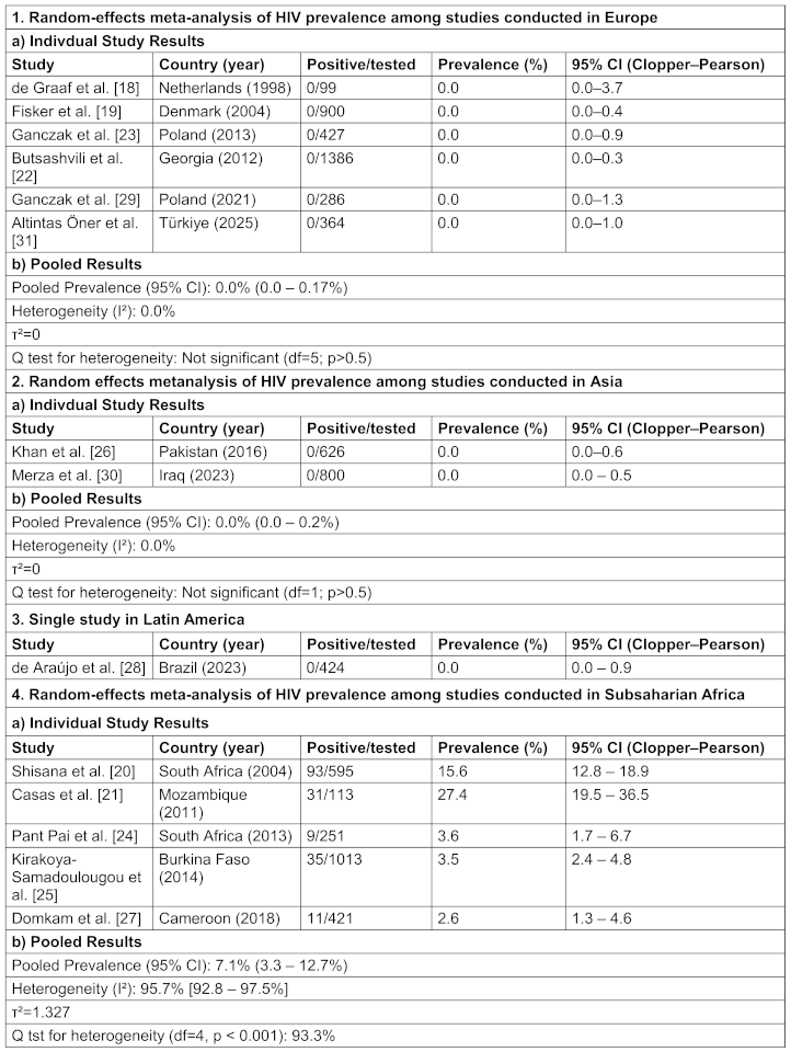 The total number of HCWs serologically tested for HIV antibodies across all studies was 7,705, with 179 HIV-positive individuals. The crude (unweighted) aggregated prevalence representing the simple overall proportion of HIV-positive cases was therefore 2.32% (95% CI 2.00–2.68%, Clopper–Pearson exact). The global random-effects pooled prevalence, however, was 0.68%, (95% CI 0.19–2.46%) and reflects the high weighting influence of numerous zero-event studies outside Sub-Saharan Africa and the extreme inter-regional heterogeneity (I²=94.3%, τ²=5.003). Table 1 [Tab. 1] summarizes the regional distribution and corresponding pooled prevalences.