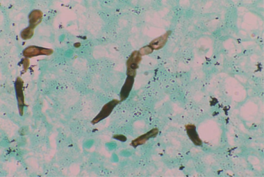 Einleitung: Bei der Phäohyphomykose handelt es sich um ein Spektrum von Infektionen, die durch pigmentierte Schimmelpilze, auch Dematiaceae oder Schwärzepilze genannt, verursacht werden. Sie enthalten Melanin, das für die dunkle Verfärbung der Hyphen und Konidien sorgt.