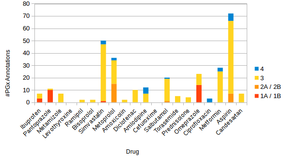 The different colors represent the levels of evidence. For some drugs no PharmGKB annotation exists (e.g. Levothyroxine). Whereas for Aspirin, 73 annotations are found, but most of them have a level of evidence of 3 or 4, so they do not count as significant for a medication check. The number of annotations varies strongly between the drugs.