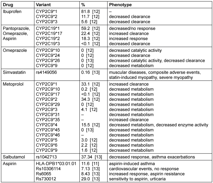 According to Barmer [10], ibuprofen was prescribed for 1,674,850 patients in 2018, which makes it the most prescribed drug in this year. It has PGx annotations with the three haplotypes CYP2C9*1, *2 and *3. These are by far the most common variants of the gene. The *2 and *3 variants may cause a decreased clearance of the drug ibuprofen. Considering the fact that a total of 1,674,850 patients were treated with ibuprofen, 195,957 patients would statistically have the haplotype CYP2C9*2 and 93,792 patients would have the haplotype CYP2C9*3. Together, both would result in decreased clearance for 289,749 people, which could have been predicted by PGx checks.