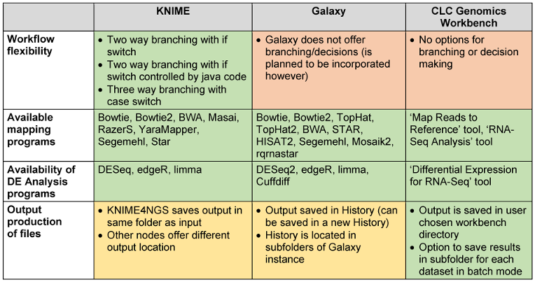 KNIME supported the scalability of analysis best due to the implemented loop structure. However, it was not selected for a recommendation for RNA-seq WF analysis since it is currently missing tools, and scripting nodes had to be used to circumvent the problem. Additionally, some of the available nodes had idiosyncratic approaches to file handling. However, unlike Galaxy and CLC, KNIME was not designed for bioinformatics analyses. KNIME’s design philosophy allows nodes from different fields to be connected easily. Therefore, KNIME can be of great use for machine learning and data integration tasks in bioinformatics, for which it offers many nodes and functionalities. Also note that the development of new nodes in KNIME is not very involved, and the missing tools could be added.