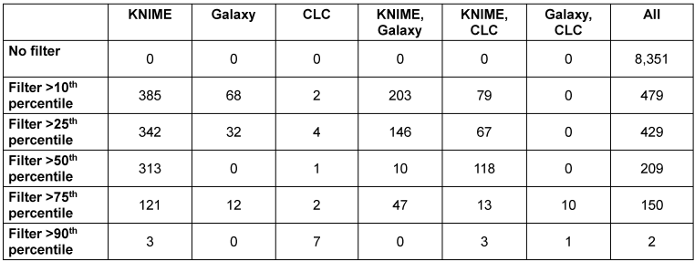 Interestingly, when filtering at the 90th percentile, CLC retains more results than KNIME or Galaxy. No biological question was analyzed in this study, and no follow-up experimental analysis was planned. For such studies, it is, however, essential to choose a cutoff, which reduces the number of results to make them accessible in the wet-lab. The question is then which WF to use in which WFMS. We hope that sharing our WFs will spark discussion and testing so that best practices can be established in the future.
