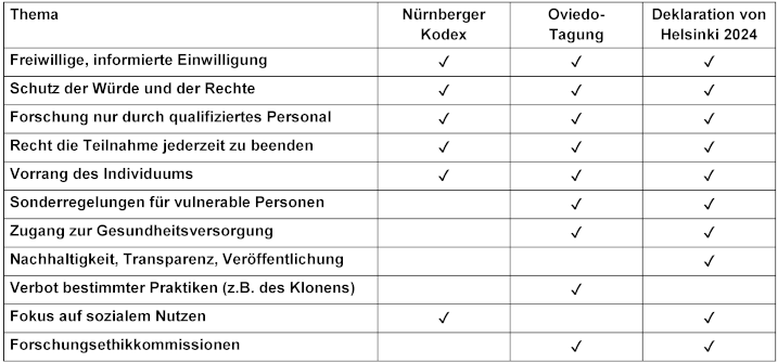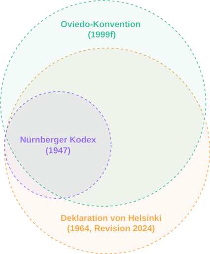 Tabelle 2: Überschneidungen und Unterschiede einiger Prinzipien (siehe Abbildung 1: Venn-Diagramm) von Deklaration von Helsinki (DvH 2024), Oviedo (1999) und Nürnberger Kodex (1947). Allen drei Deklarationen gemeinsam sind die Prinzipien der freiwilligen, informierten Einwilligung, des Vorrangs des Einzelnen, des Schutzes der Würde und der Rechte, der Qualifikation der Forscher*innen und des Rechts, von der Teilnahme zurückzutreten. Nürnberg und Helsinki konzentrieren sich auf den sozialen Nutzen. Die Oviedo-Konvention und die Deklaration von Helsinki betreffen insbesondere den Umgang mit Vulnerabilität, eine gerechte Gesundheitsversorgung und die Rolle der Ethikkommissionen.