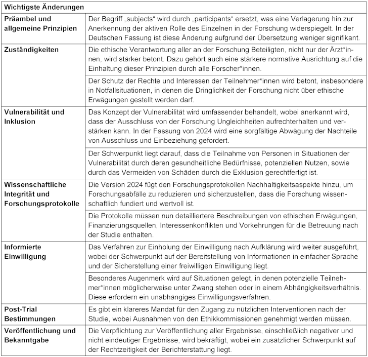 In der Version 2024 der DvH wurde die Terminologie deutlich überarbeitet. Die Analyse der terminologischen Änderungen bezieht sich auf die englischen Originalfassungen der DvH von 2013 und 2024. Die Terminologie wurde im Original von „subjects“ (z. Dt.: Subjekte) auf „participants“ (z. Dt.: Teilnehmer*innen) umgestellt, was einen stärker teilnehmerzentrierten Ansatz widerspiegelt, der die Freiwilligkeit und die Achtung der Autonomie betont. In der deutschen Übersetzung der Version von 2013 wurde „human subjects“ allerdings bereits stellenweise als „Teilnehmer“, stellenweise auch als „Menschen“ übersetzt. Darüber hinaus werden in der Fassung von 2024 die ethischen Verpflichtungen nicht nur auf Ärzt*innen, sondern auf alle an der medizinischen Forschung beteiligten Forscher*innen ausgedehnt, was auf eine breitere Anwendung der ethischen Standards hinweist. Schließlich werden in der neuen Fassung bestimmte ethische Erwägungen stärker betont, insbesondere in Bezug auf die Autonomie, die Privatsphäre und die Rechte der Teilnehmer*innen sowie Überlegungen zu strukturellen Ungleichheiten. Dazu gehört auch eine ausdrücklichere Erwähnung der wissenschaftlichen Integrität und der Notwendigkeit, Fehlverhalten in der Forschung zu vermeiden. Die wichtigsten Änderungen sind in Tabelle 3 [Tab. 3] zusammengefasst.