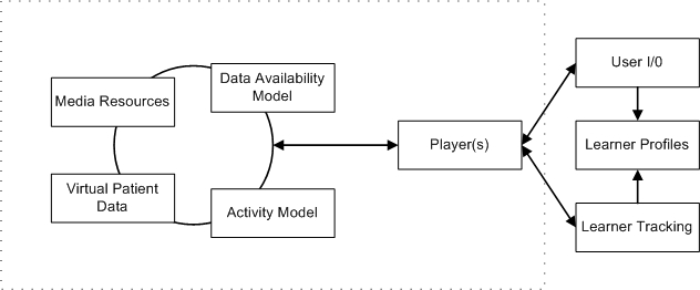 Um virtuelle Patienten aller beteiligten und zukünftigen Systeme möglichst gut abbilden zu können, gliedert sich der MedBiquitous Virtual Patient Standard in zwei Teile: Zum einen die Spezifikation der Komponenten zur Charakterisierung eines virtuellen Patienten und zum anderen die Anforderungen an einen Player (siehe Abbildung 1 [Abb. 1]).