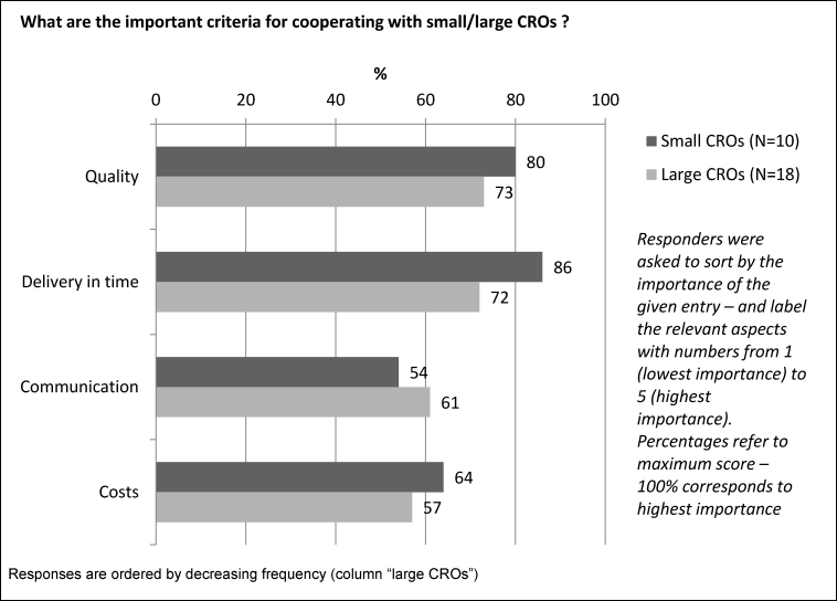 There was experience with large CROs in 18 responders (82%), compared to less experience with small CROs (10 responders, corresponding to 45%). The sequence of the main criteria for a partnership with a large CRO (ranked by importance) was: 1. Quality, 2. Delivery in time, 3. Communication, 4. Costs – compared to the following sequence for small CROs: 1. Delivery in time, 2. Quality, 3. Costs, 4. Communication (Figure 3 [Fig. 3]).