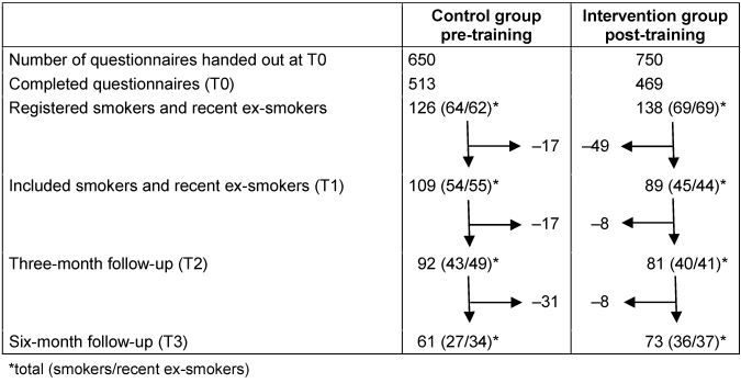 The number of completed questionnaires at T0 varied between the pre-training and post-training group (78% vs. 62%). Furthermore, the proportion of registered smokers and recent ex-smokers which were included in the study and interviewed at T1 also varied between both study groups (86% vs. 64%). The reasons for these differences are not entirely clear; the lower availability of study personnel in the post-training group and changes in the seasonal distribution of the patient cohort could have contributed. We assume that patients who were not motivated to participate in smoking cessation were more likely not to participate and that this may have influenced internal validity and caused a selection bias in favor of the intervention.