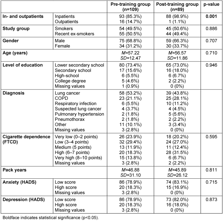126 of the patients in the pre-training group and 138 of those in the post-training group met the inclusion criteria. Inclusion criteria were being an active smoker or a recent ex-smoker having quit less than one year ago according to the self-declared smoking status. A biochemical validation of the smoking status was not carried out. 17 vs. 49 of those patients were excluded because they met the exclusion criteria. These were the disability to participate in the discharge interview (T1) due to poor health, or unavailability for the discharge interview (T1). Finally, we included 109 vs. 89 patients who participated in the discharge interview (T1).