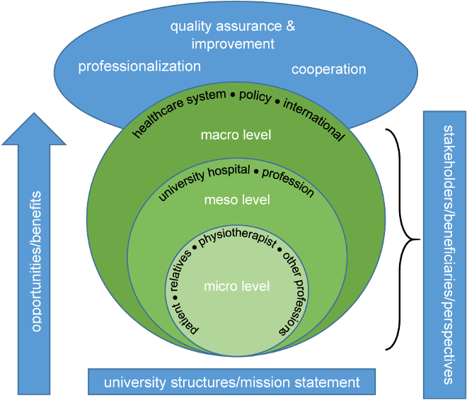 A large number of stakeholders benefit at the micro, meso and macro level of the healthcare system (Figure 2 [Fig. 2]). At the micro level, patients and their relatives, physiotherapists and other healthcare professionals should be named as beneficiaries of physiotherapy research. The meso level includes university hospitals and physiotherapy as a profession. The healthcare system, society and the international community are assigned to the macro level as stakeholders.