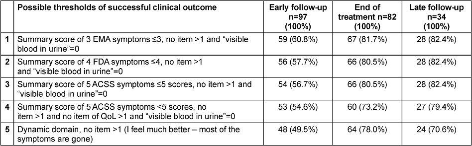 Table 2 [Tab. 2] shows the patient-reported-outcome (PRO) during an early follow-up visit (2–4 days after start of treatment), at end of treatment (5–9 days after start of treatment), and at a late follow-up visit (10–30 days after end of treatment) with clinical successful outcome (n, %) according to five different thresholds [18]. A summary score of the five typical symptoms of ACSS of ≤5 with no symptom more than 1 (mild) and without visible blood in urine was favoured, although the results obtained with the three or four symptoms mentioned by EMA [8] and FDA [9] guidelines, respectively, used in a similar way also show very similar results at end of treatment and late follow-up. Therefore, it would be recommended to use one of these threshold criteria for the study protocol. If QoL criteria are added to the evaluation of the ACSS typical symptoms, the results of successful clinical outcome are somewhat reduced. The overall patient’s clinical assessment (“Dynamic” domain) alone was not sensitive enough in our opinion for a suitable PRO measure [18].