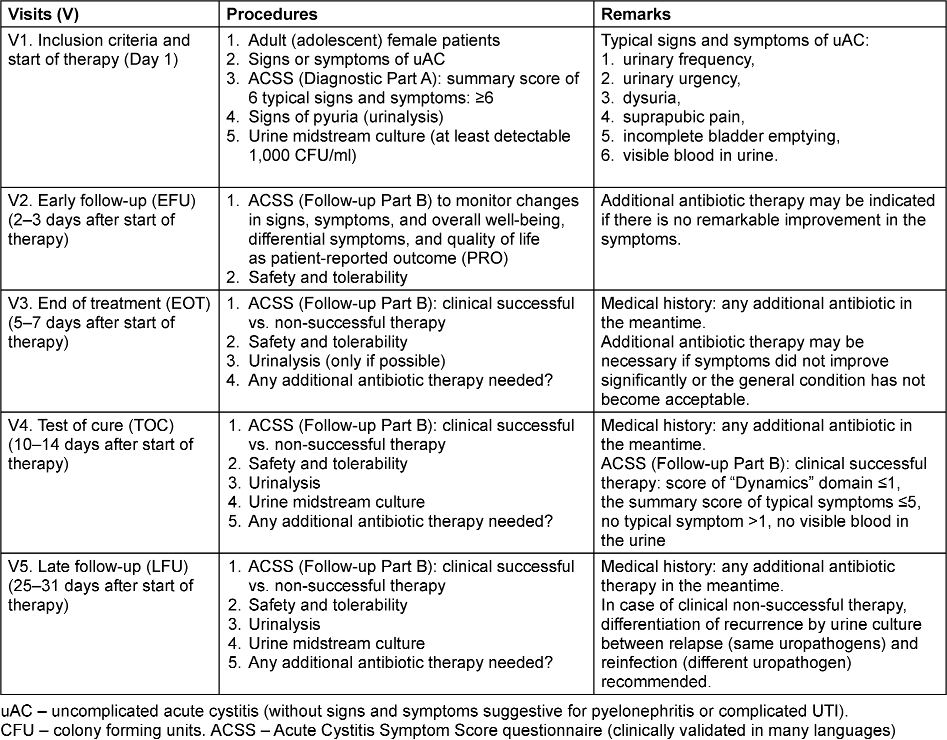According to the FDA guidelines [9], the inclusion criteria for patient selection are fairly similar: patients should be adult females and, if appropriate, adolescent females with evidence of pyuria and at least two of the following signs or symptoms of uncomplicated urinary tract infection (uUTI): dysuria, urinary frequency, urinary urgency, suprapubic pain.