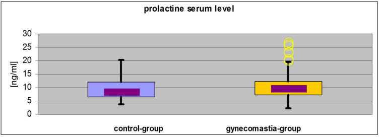 Prolactin is not directly involved in the pathogenesis of gynecomastia. Our review of the literature revealed, however, that patients with an elevated prolactin level showed an increased incidence of gynecomastia [6]. In patients with increased prolactin levels, the presence of a prolactinoma of the pituitary gland should always be excluded by diagnostic imaging, for example magnetic resonance imaging (MRI) or computed tomography (CT). Empirical evidence suggests, as does our study, that patients with elevated levels of prolactin have a higher risk of developing gynecomastia. The literature, however, does not offer a pathogenetic explanation.