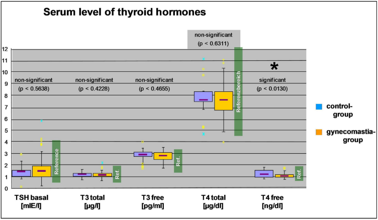 Hyperthyroidism, as evidenced by a decreased thyroid-stimulating hormone (TSH) level, is associated with a direct stimulation of peripheral aromatase by free T4 and T3. As a result, aromatization of testosterone to estrogen increases. In addition, hyperthyroidism increases SHBG, which binds free testosterone. Since bound testosterone is biologically ineffective, there is a relative lack of testosterone. This explains the increased incidence of gynecomastia in patients with hyperthyroidism. In our study, gynecomastia patients had lower fT4 levels than the control group. Their fT3 levels were, however, higher. This possibly reflects a less relevant etiogenetic role of thyroid function in the development of gynecomastia in the patient population investigated here.