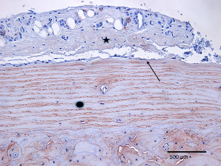 Figure 1: Histological image after subperiosteal preparation with a periosteal elevator. The star present the periosteal, the gear wheel the bone. The tip of the arrow shows the boundary surface between bone and periosteal.