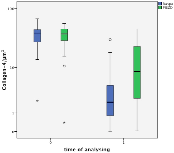 Figure 3: Collagen I levels at different times after subperiosteal preparation with a periostal elevator and with the piezoelectric device. Outliers that are more than 1.5 times the length of the box below the 25th percentile or above the 75th percentile are represented as circles and outliers that are more than 3 times the length of the box below the 25th percentile or above the 75th percentile are represented as asterisks.