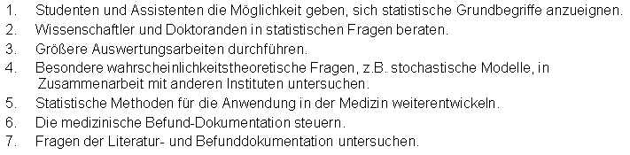 „Die Beteiligung des mathematischen Statistikers an der Bearbeitung der sich im Rahmen der Fakultät und ihrer Einrichtungen ergebenden Dokumentationensaufgaben ist insgesamt gesehen von nebensächlicher Bedeutung, verglichen mit den großen Aufgaben, die ihn und seine Mitarbeiter als Berater bei der Planung und Auswertung vieler wissenschaftlicher Untersuchungen erwarten. Besonders seine notwendige Beteiligung bei der Planung von Untersuchungen muss mit Nachdruck hervorgehoben werden, weil von dieser Funktion viel zu wenig Gebrauch gemacht wird und weil man vielfach geneigt ist, in der Statistik lediglich ein Verfahren zu sehen, abgeschlossene Untersuchungen mit statistischen Maßzahlen zu verzieren oder unbefriedigende Versuchsergebnisse zu glätten.