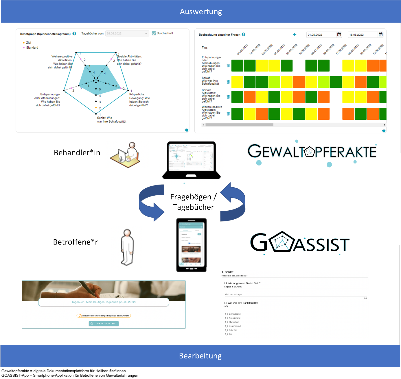 Fragebögen und Ressourcentagebücher werden in der GOASSIST-App von Gewaltbetroffenen ausgefüllt (unterer Bereich)