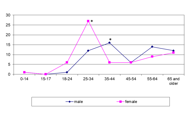 Even larger differences were found in the sex-age structure of patients with LNTB. In Siberia, LNTB was seen mostly in men of 25–44 years (p <0.001; figure 6) while it was diagnosed in the younger range (18–34 years) in females in Tajikistan (p <0.001; figure 7). In some cases, the patients presented late with already established fistulous forms.
